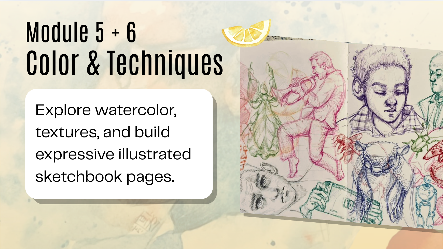 Across 7 modules and 5+ hours of instruction, I walk you through everything from foundational line work and observation drawing to watercolor techniques and full expressive portrait painting. Every lesson is demo-heavy, so you're never just listening; you're watching my process unfold in real time, then following along at your own pace.